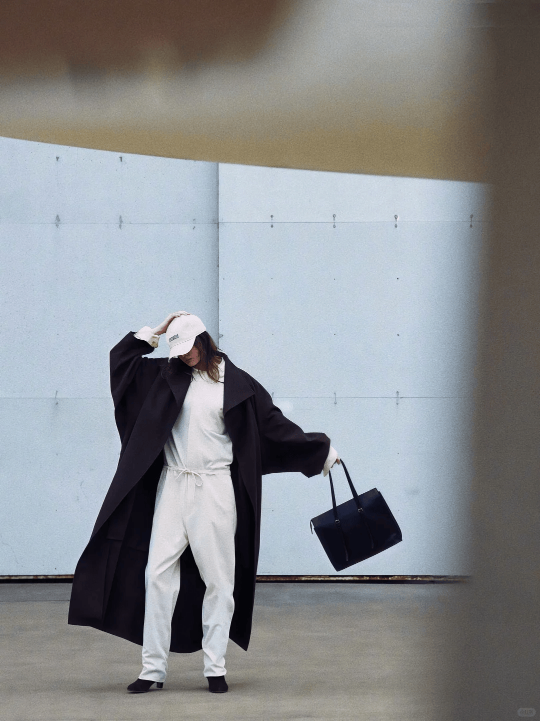 H型大衣搭配九分直筒裤,露出脚踝或短袜,降低臃肿感。