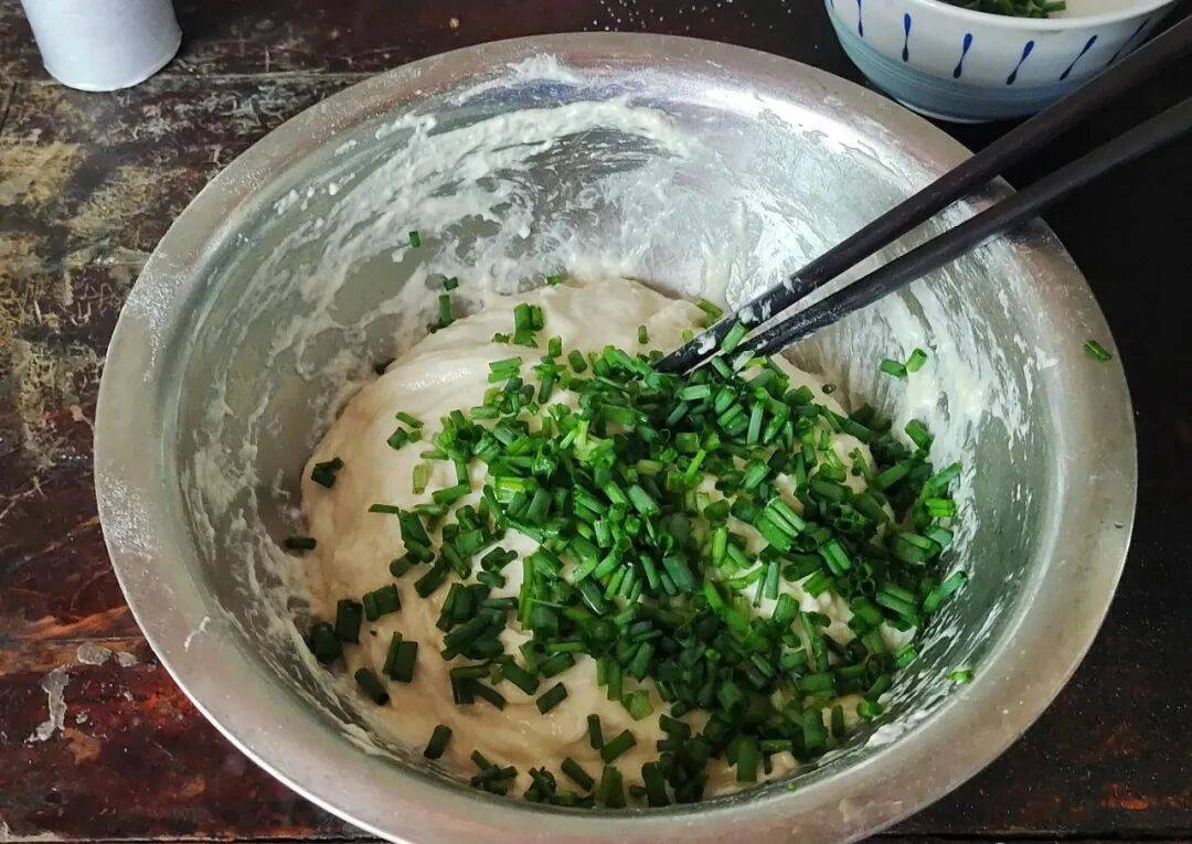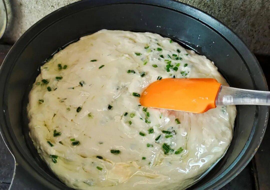 发酵面糊加葱花、盐搅匀