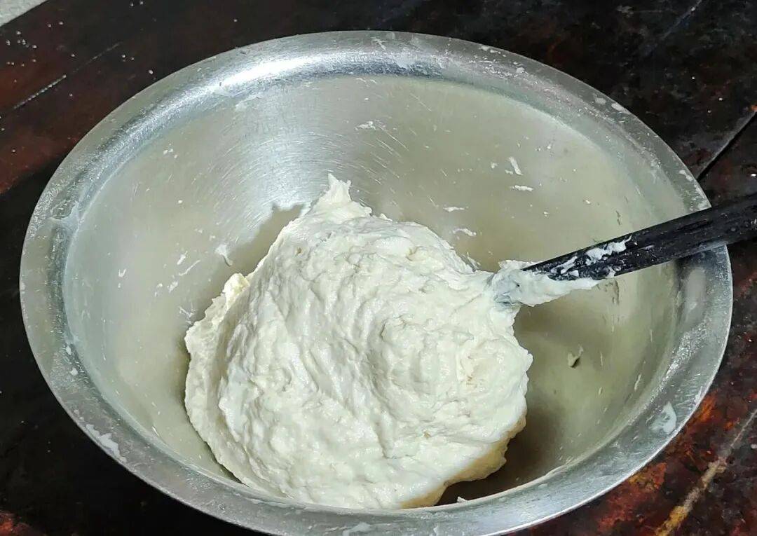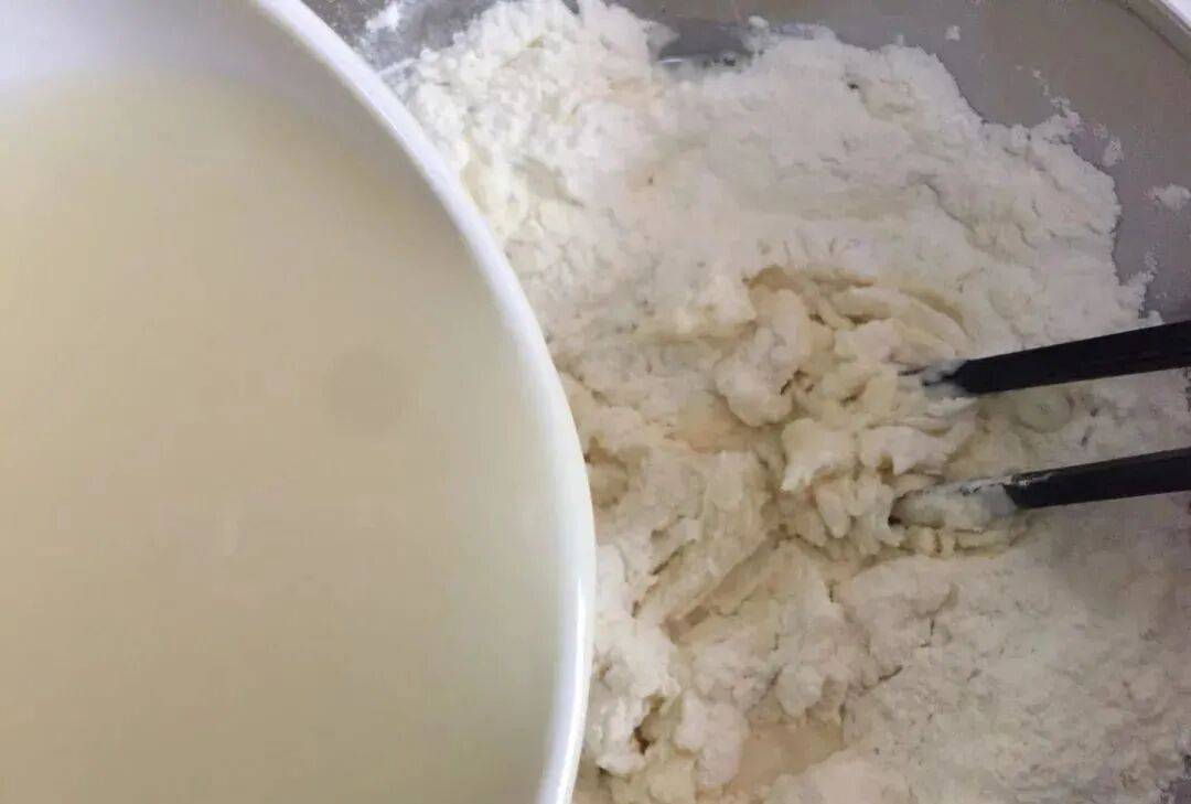 3. 搅拌成面絮:酵母水慢慢倒入面粉中,边倒边搅拌成无干面粉的大面絮状。