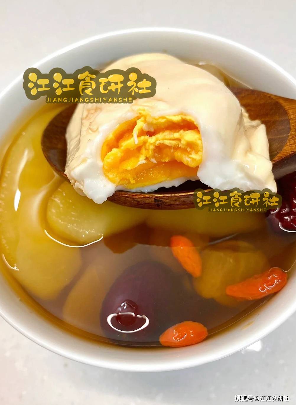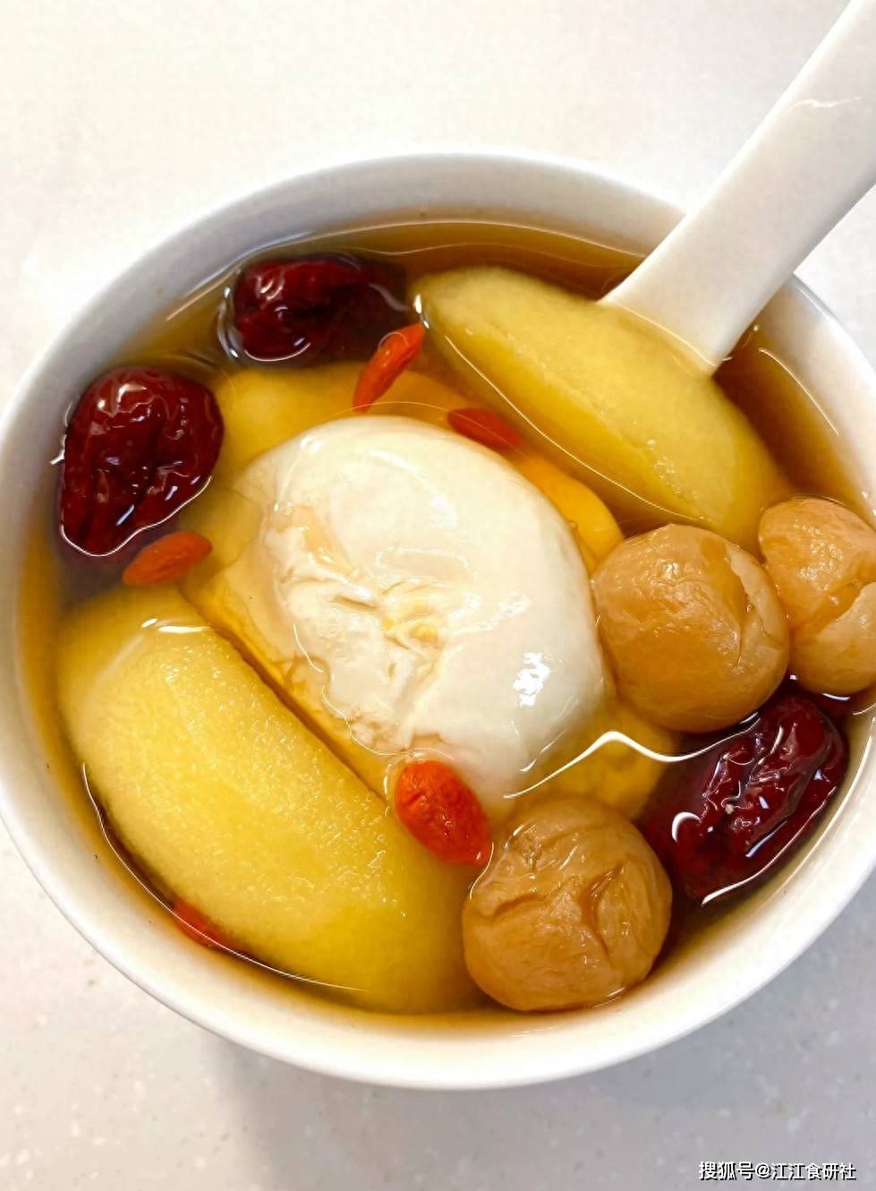 做法:将苹果、红枣、桂圆肉和姜片放入砂锅中,煮至汤色呈淡淡的琥珀色。然后,卧入荷包蛋,煮3-4分钟即可。最后加入红糖和枸杞,搅拌均匀后关火。