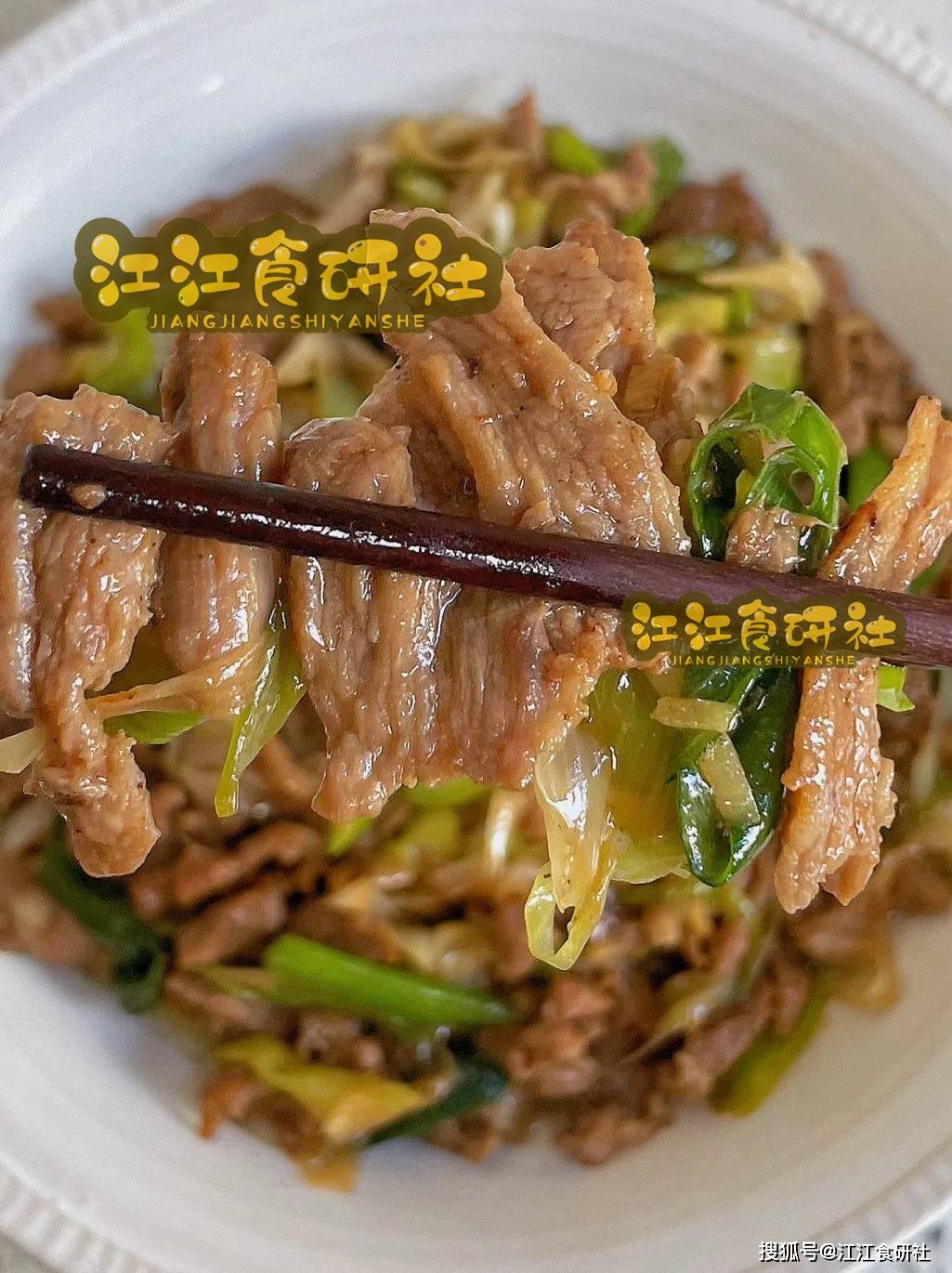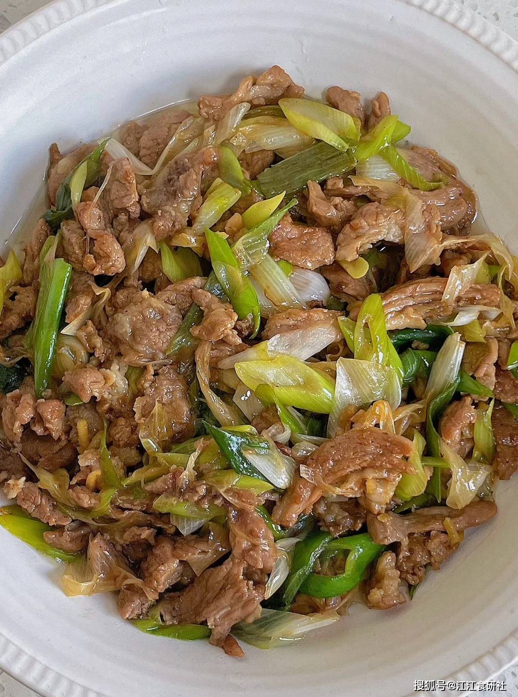 做法:羊肉片腌制后与大葱一同爆炒,最后淋入生抽、老抽、白糖等调味料。