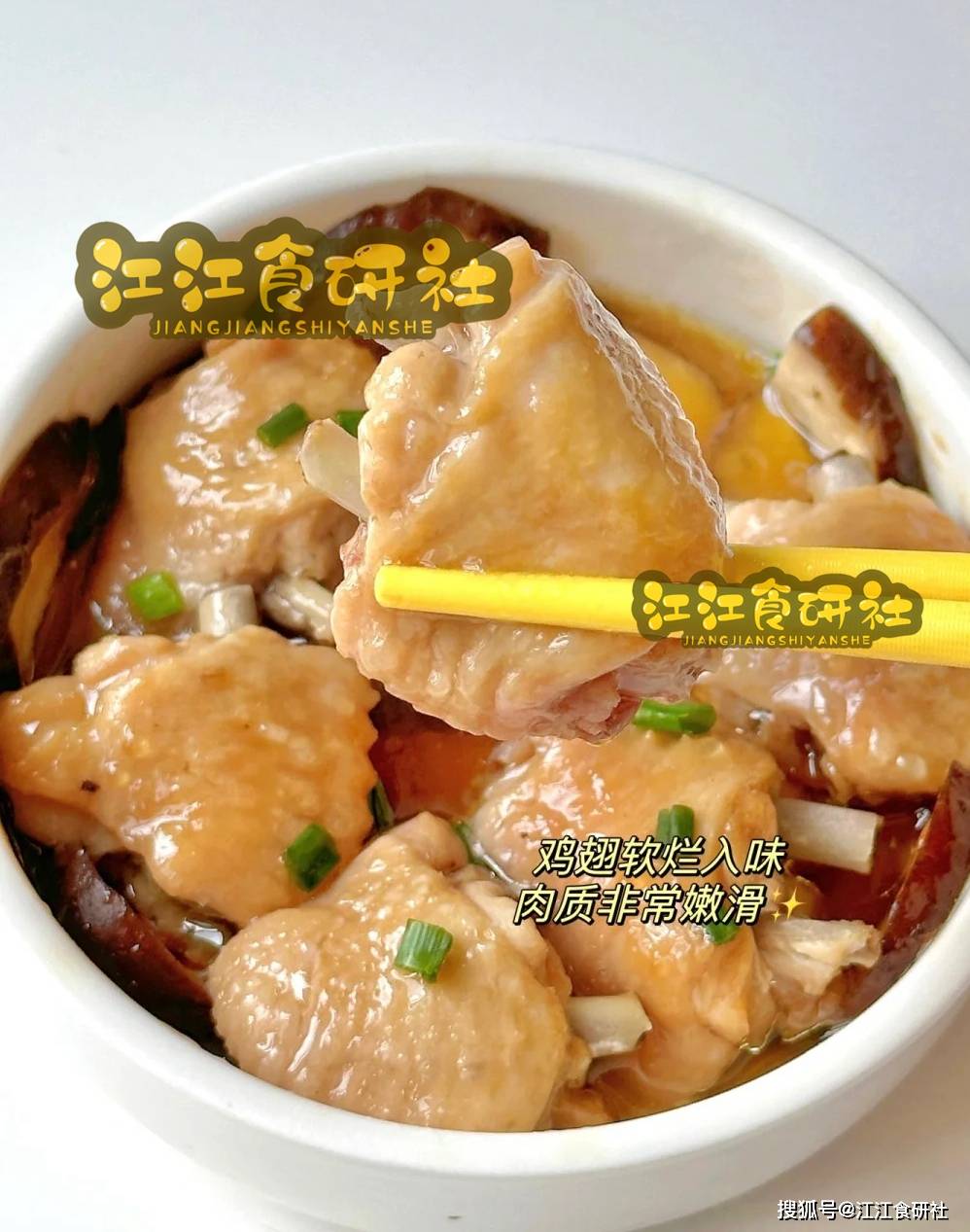 做法:鸡翅腌制后与香菇一同蒸煮,最后撒上葱花或香菜点缀。
