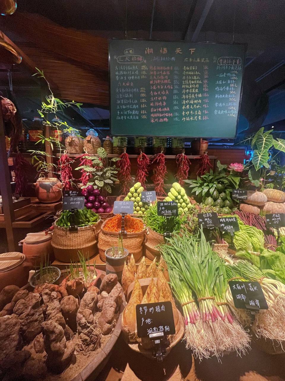 进门就能看到一个小型“菜市场”,里面摆的都是各种从湖南运来的特色食材。 后面有一个小黑板,上面写着菜价,每道菜从几十到100多不等,在北京CBD这个地方着实不贵。