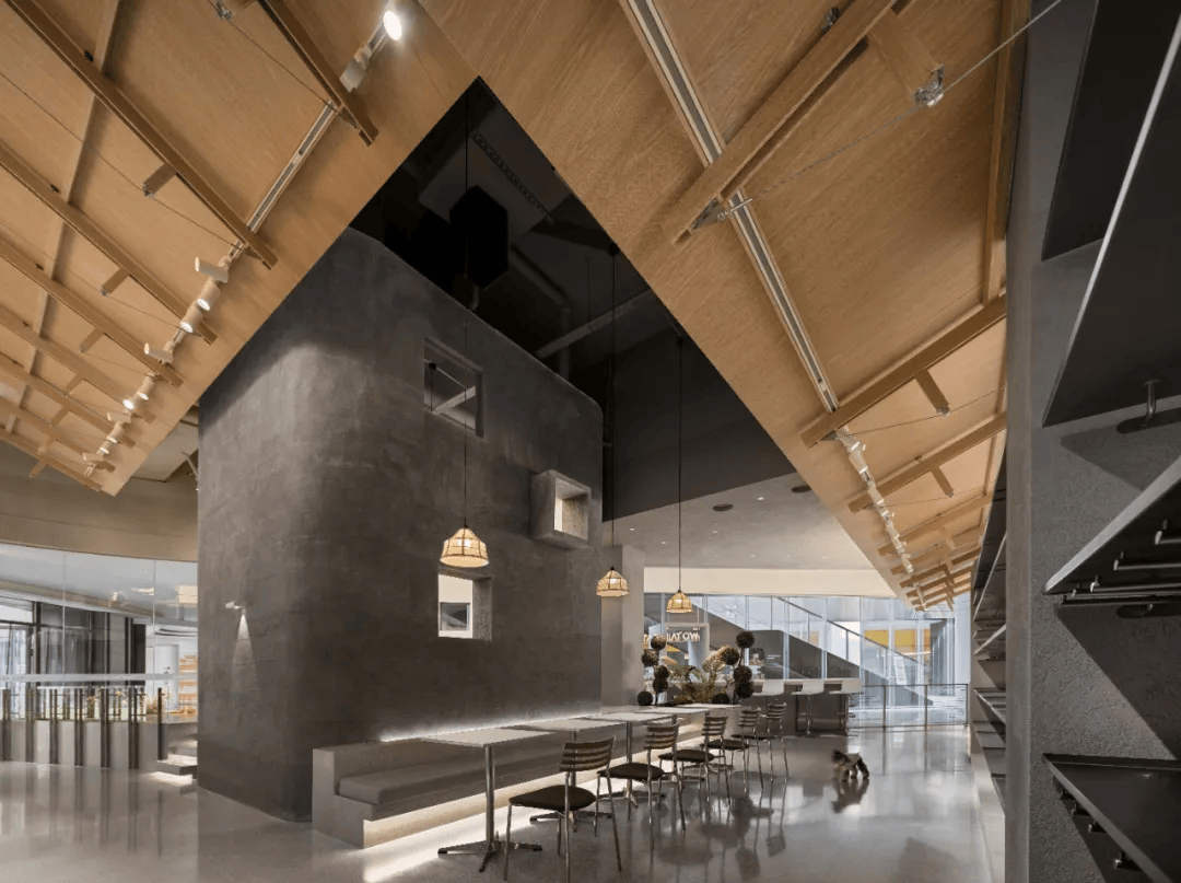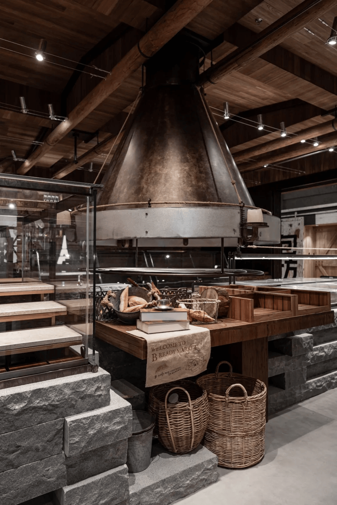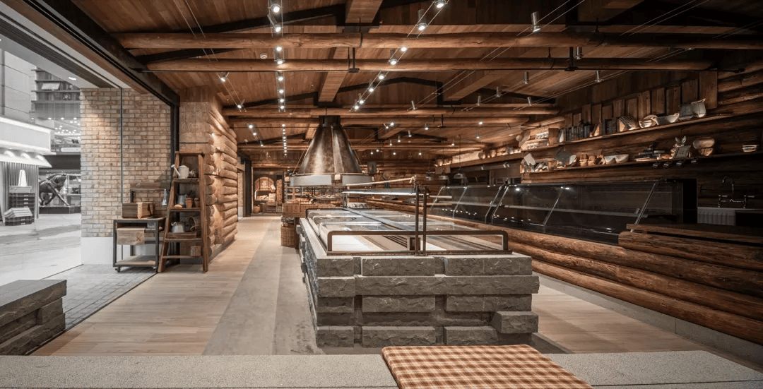 或者设计打造的“面包工坊”,以温暖自然的木材与石材为主材,营造出如面包出炉般的治愈氛围。空间中最具标志性的设计是一座大型壁炉造型的排烟罩,它不仅强化了现烤面包的现场感与参与感,更让顾客仿佛置身于面包诞生的瞬间,感受热气与香气交织的幸福体验。在这里,购物不再是一种简单的行为,而是一次温暖而美好的情感之旅。