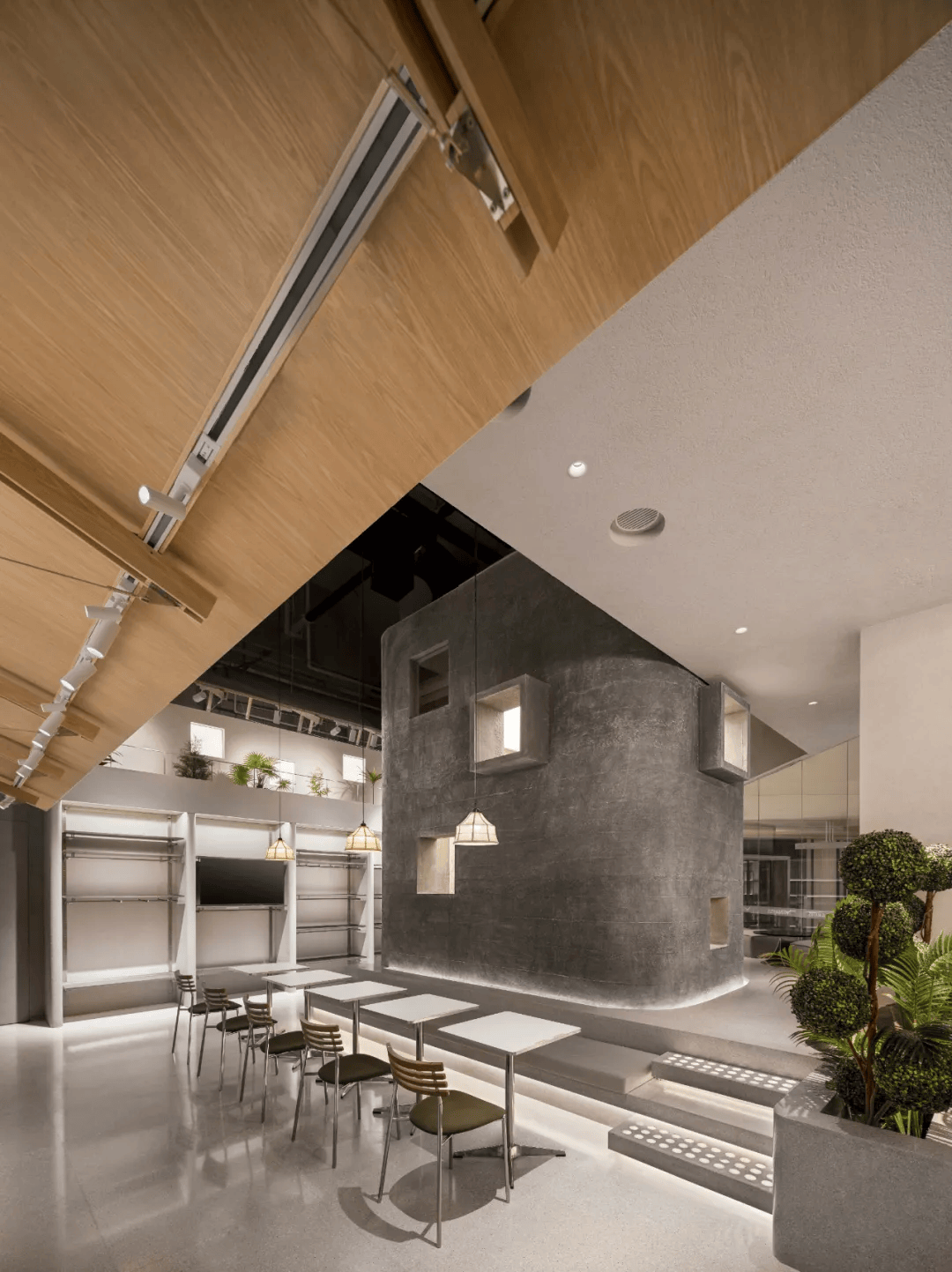 TWO TAILMATES小狗客厅由YOUNG设计,位于一处270°开敞街角,通过宠物零售、鲜食、洗护三业态融合,打造人宠共处的社交空间。设计围绕核心筒展开动线,设有抬高区域与洄游路径,增强宠物活动趣味。可调式货架、洗护区实时显示屏及多功能立柱利用,提升灵活性与互动性。高低错落的空间层次及开放边界设计,使其成为集视觉、功能与宠物友好理念于一体的城市公共样本。
