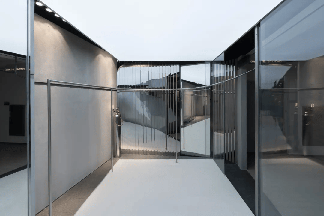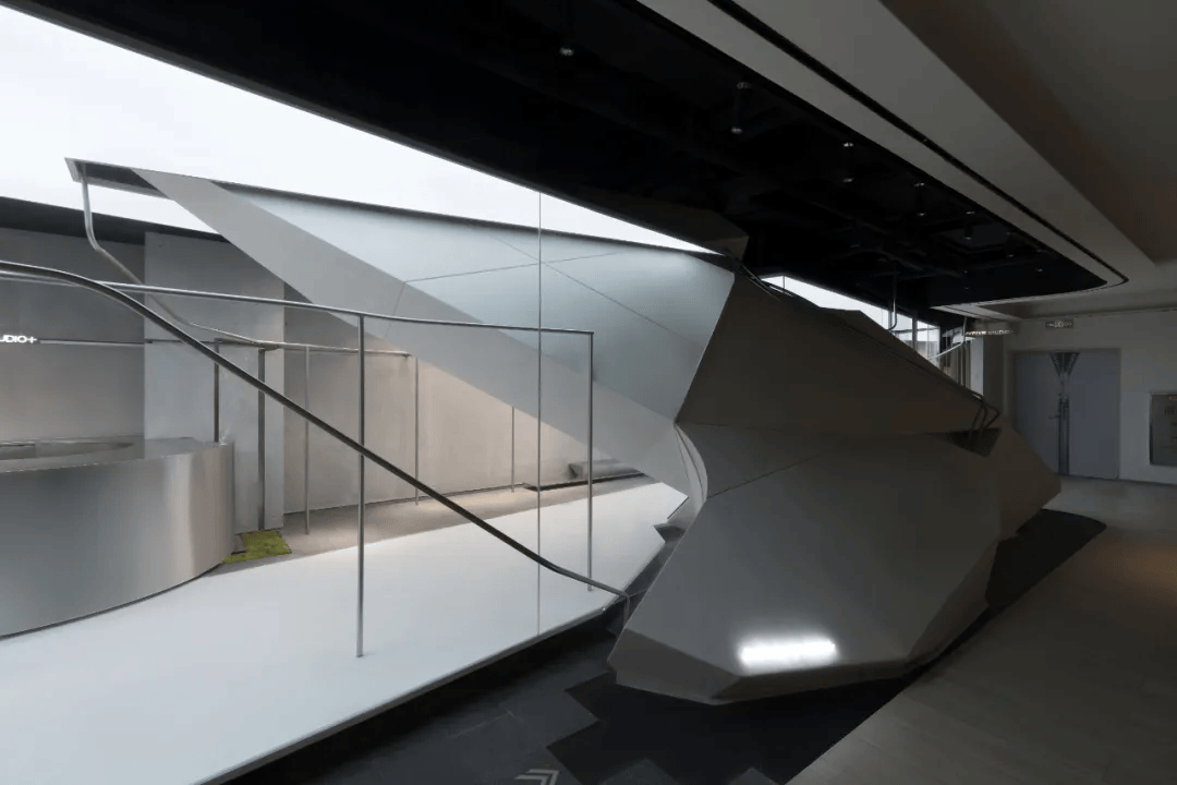 物质组在广州汇美国际服装城打造的项目,是一个集展示、表演与传播于一体的零售空间。设计通过几何体块、线性杆件与光影长廊构建出三重系统,使空间超越传统销售场景,转化为一个“折叠舞台”。核心异形几何构筑物如残片般嵌入空间,集成音响与储藏功能,同时划分场域。斜向布局的长廊成为走秀舞台与社交传播背景,不锈钢杆件则形成漂浮衣物的展示秩序。材质与灯光营造冷峻氛围,呈现出极具未来感的服装零售新范式。