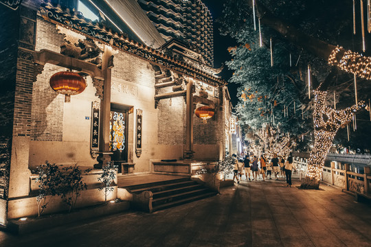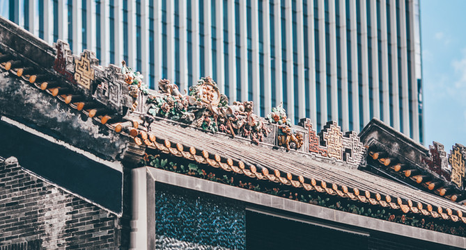 虽然都是岭南仿古建筑,但是屋瓦上依旧满是细节丰富的砖雕,与背后现代的钢结构楼宇形成鲜明对比。这里,你能看到多面广州的独特魅力。