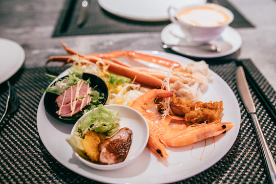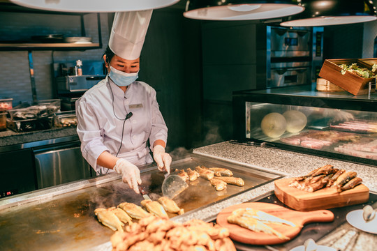 热食的鸡趴、羊排、猪肘在海鲜面前也当仁不让,每每走过都能闻到一阵肉类特有的香气。想品尝中餐的,在餐厅可以吃到广州特色烧腊与粥粉面。海量美食几乎cover了所有口味的食客,自助让众口不再难调。