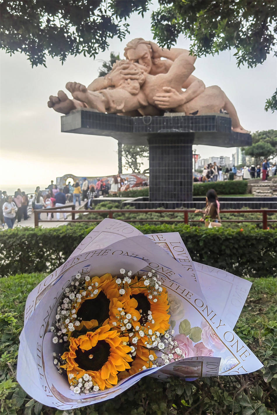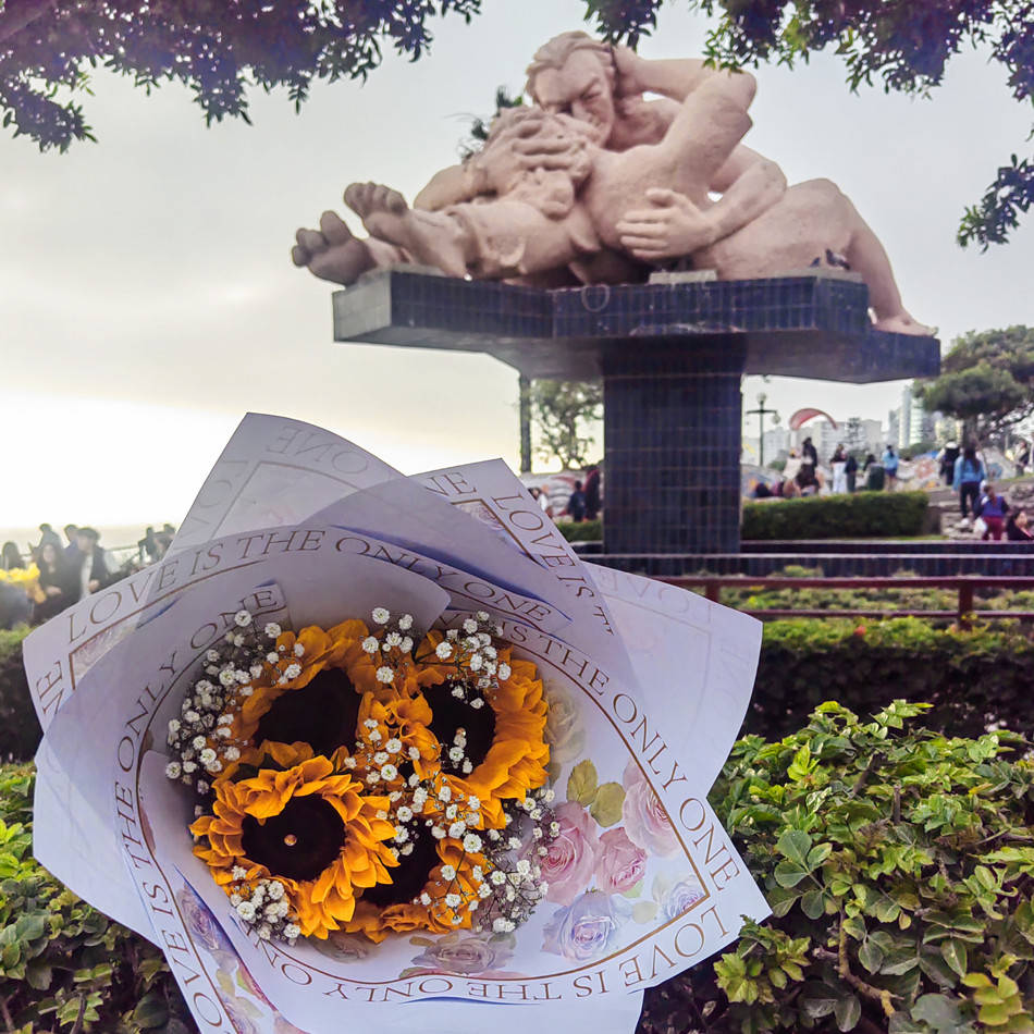 利马最著名的公园之一是位于海边悬崖上的“爱情公园”。我曾在南美春分那天到访,那天亲友和情侣间流行送黄花,我借得一束作为前景拍照留念,花束也暗示了拍摄的时间。