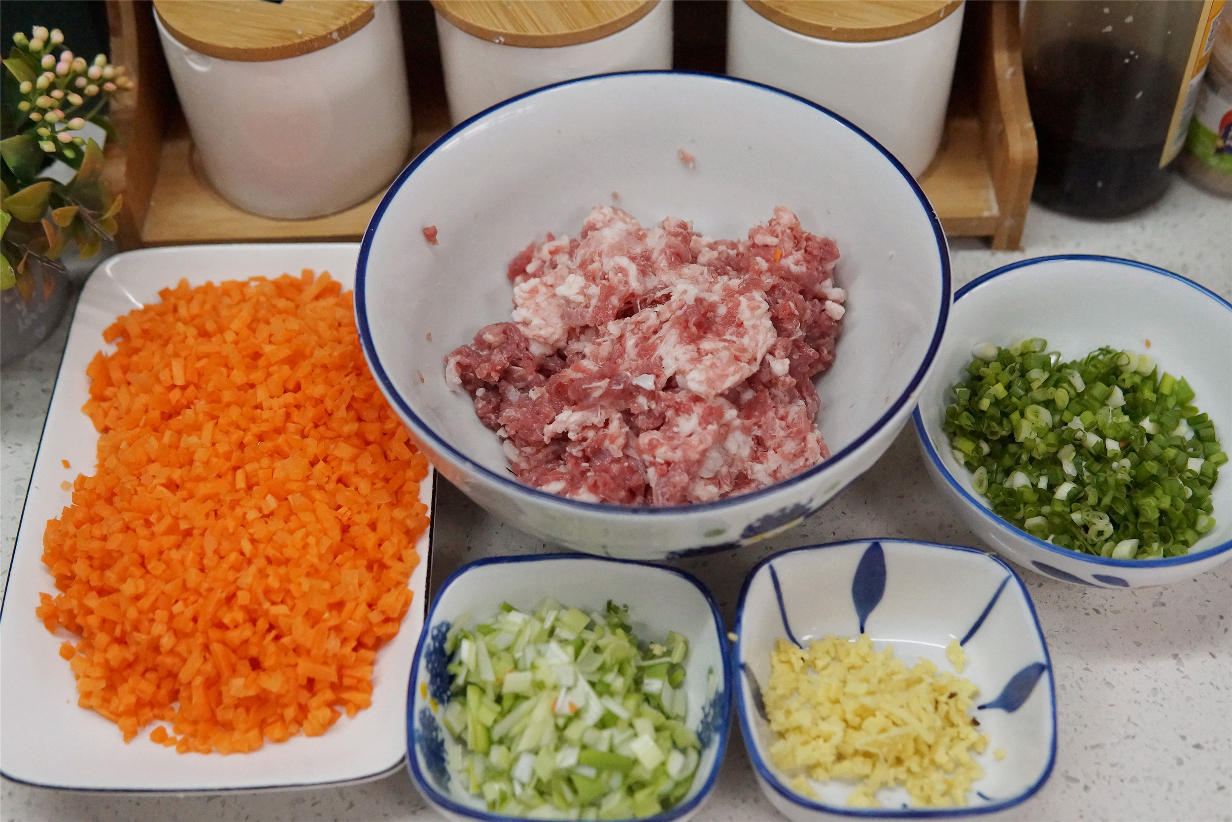 3、肉馅加 1 勺生抽、1 勺老抽、半调羹白胡椒、姜末、盐、鸡精,搅匀后放小葱碎、胡萝卜碎,继续拌匀。