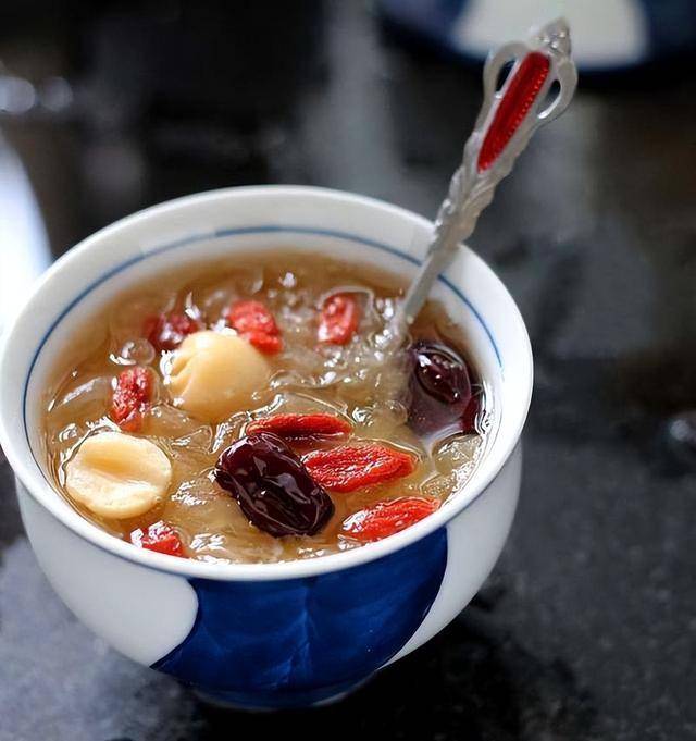 食材:银耳1朵、莲子半小碗、红枣半小碗、干桂圆1小蝶、枸杞1小蝶、冰糖适量、水适量