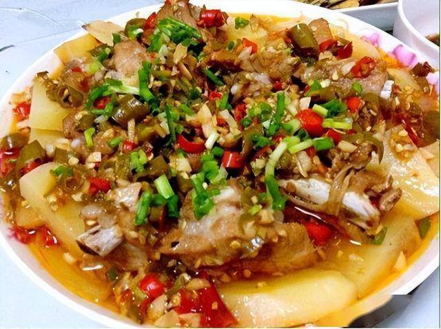 2、净锅放油烧热,放酸菜片、泡椒节、野山椒节炒香后,掺入适量鲜汤烧开,再把肉片逐一地下入锅里,加盐、味精调好味,然后下粉丝,略煮后撒入葱花,即成。