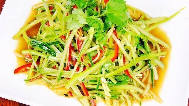 3、然后再放入黄瓜、青红椒丝,采用颠盆的方式搅拌,使其充分入味,拌匀以后,就可以摆盘上桌了。
