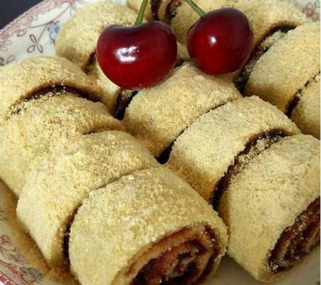 6.把活的面擀皮弄平,铺上豆沙,卷起来