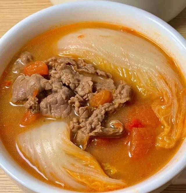 3、煸炒出番茄汁后,再加入娃娃菜一起翻炒,接着加入适量的清水大火煮开,然后放入腌制好的牛肉滑熟。