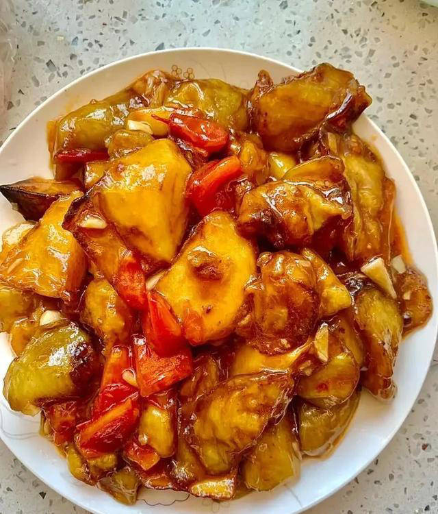 4. 倒入茄子,加入生抽、蚝油、鸡精、盐、糖、番茄酱,大火翻炒均匀。淋入适量水淀粉勾芡即可。