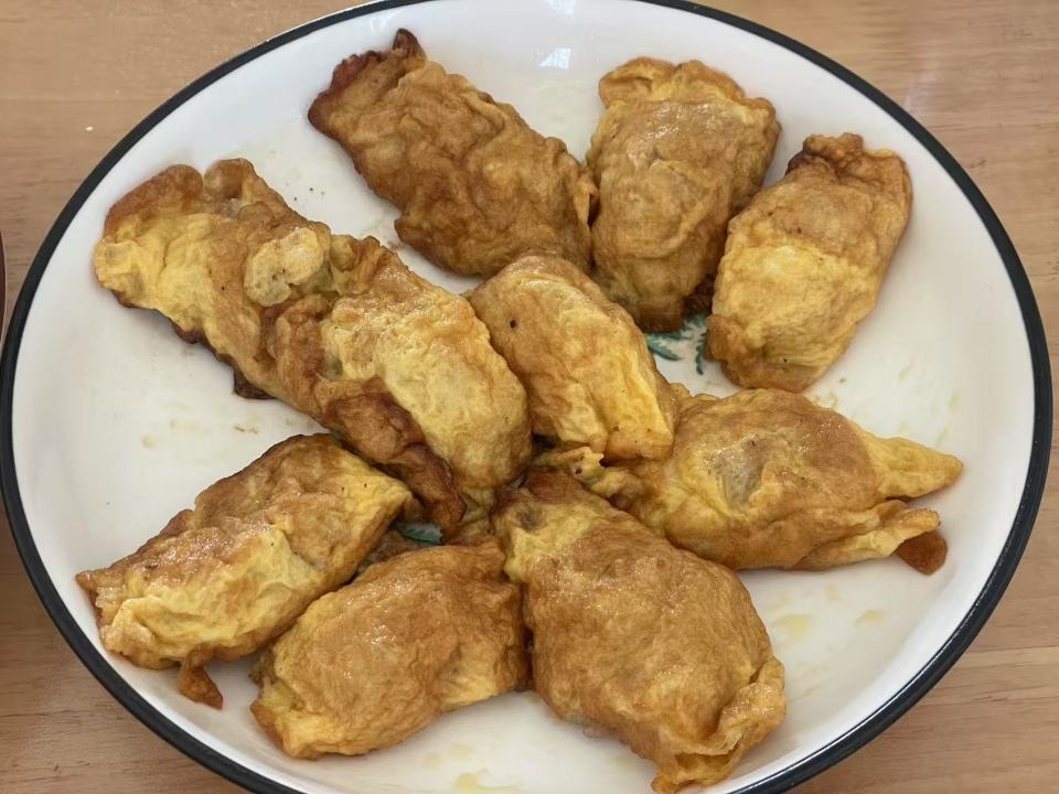 鸡蛋饺子 这是一道湖南特色菜,小时候,这道菜只有在过年过节的时候才能吃到,因为做起来比较复杂,所以现在很少有人自己在家做了,自己做的鸡蛋饺子,蛋皮煎得香香的,比菜市场买的好吃太多了。