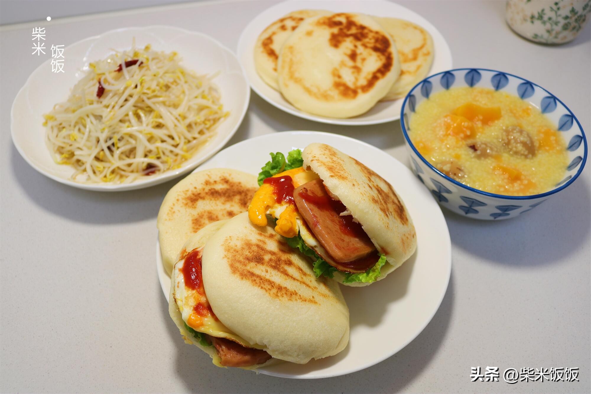 山药发面饼、红薯红枣小米粥、醋溜绿豆芽 山药发面饼做法:①山药去皮蒸熟,压成山药泥。加酵母、面粉揉成面团。②分成小面团,擀成小饼,放冰箱冷藏发酵一个晚上。③早上起来,直接烙饼。 绿豆芽:热油放入蒜末和红辣椒炒香,放入绿豆芽,加盐、白醋、味精,大火炒至断生即可。 红薯红枣小米粥是电饭煲预约的。