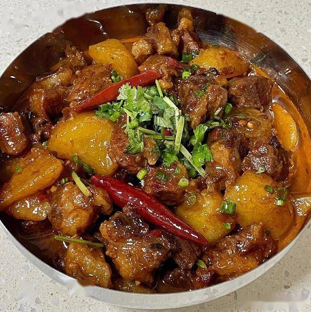 材料:牛肉 300 克、土豆 2 个、洋葱 1 个、姜片、葱段、八角、桂皮、香叶、料酒、生抽、老抽、盐。   做法:   1. 牛肉洗净切块,冷水下锅,加入姜片、葱段、料酒,焯水去腥,捞出沥干水分。   2. 土豆去皮切块,洋葱切块。   3. 锅中放少许油,放入洋葱块炒香,加入牛肉块翻炒均匀。   4. 加入姜片、八角、桂皮、香叶炒香,倒入适量生抽、老抽翻炒上色。   5. 加入没过牛肉的清水,大火烧开后转小火炖煮 1 小时左右。   6. 放入土豆块,继续炖煮 20 - 30 分钟,至土豆软烂。   7. 最后大火收汁,根据个人口味适量加盐调味即可。   八、西红柿炒鸡蛋